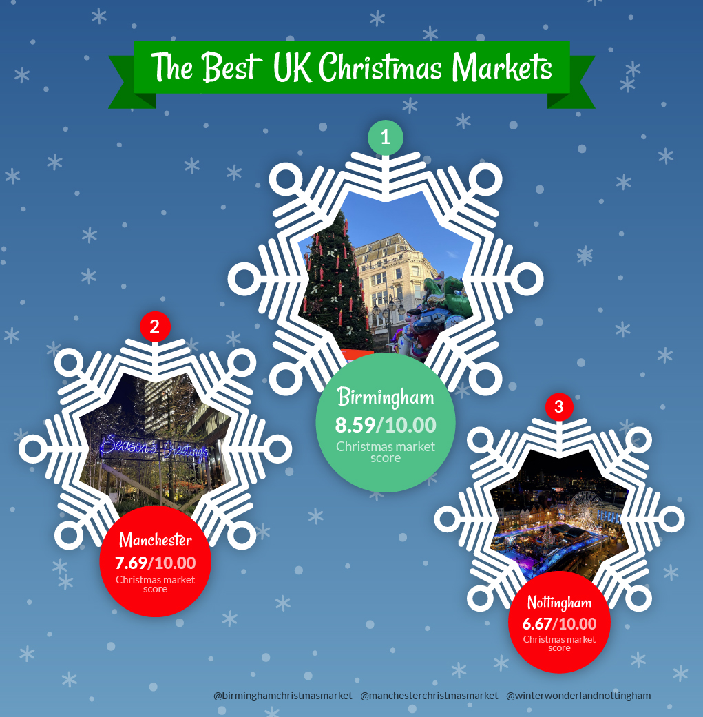 Birmingham stole the festive crown for its Christmas market, winning first place on our UK list with an impressive 8.59 out of 10 score.