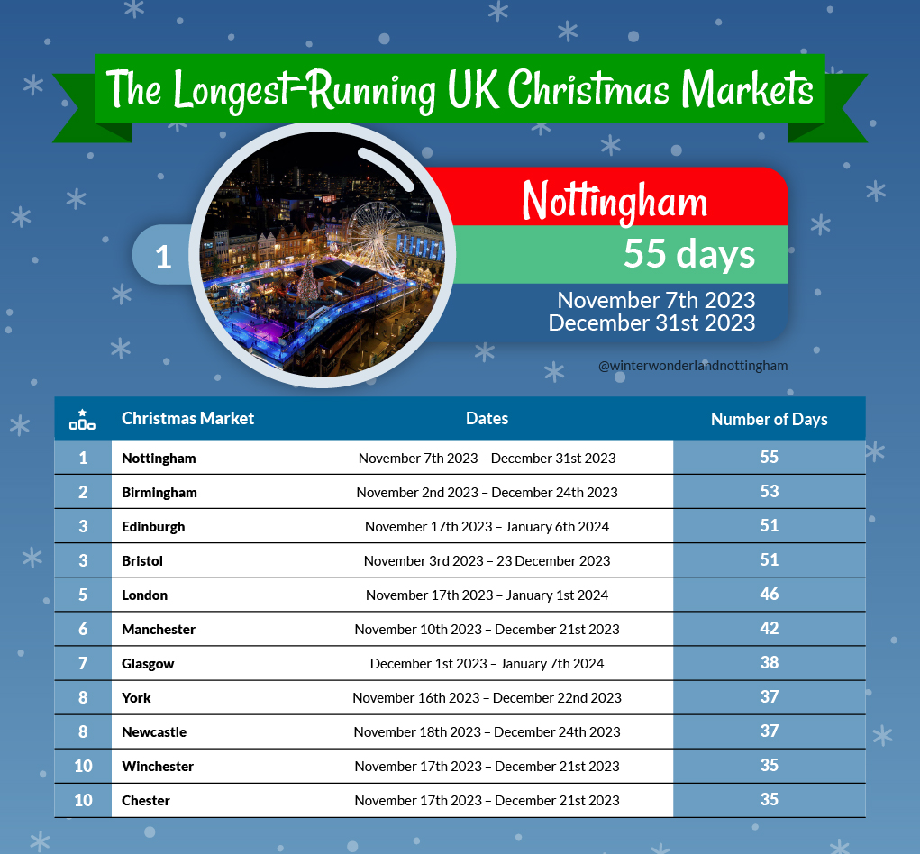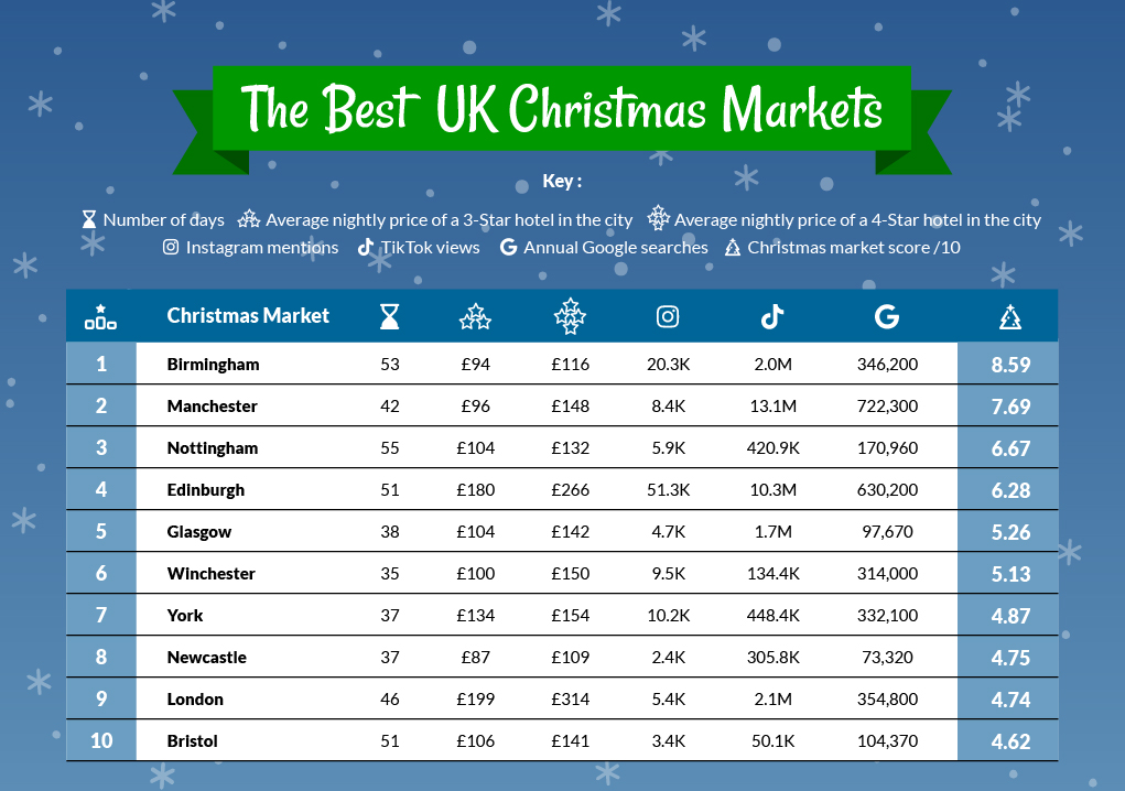 Nottingham hosts the longest-running UK Christmas market (55 days) and records 5,941 hashtags. There were also 170,960 searches conducted in the last year. Nottingham is a little pricier than Manchester and Birmingham, as a three-star hotel costs, on average, £104 per night and up to £132 for a four-star stay.