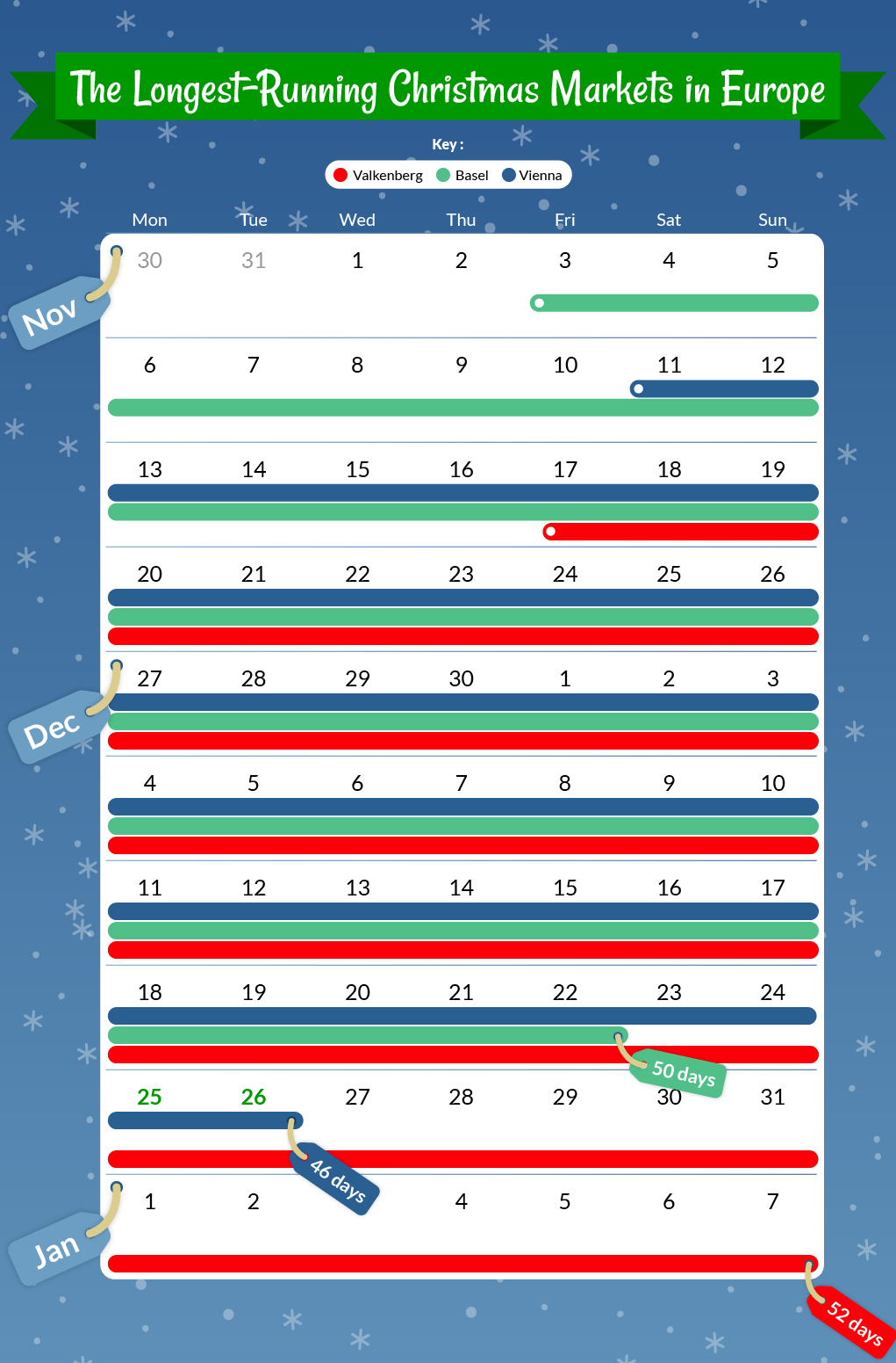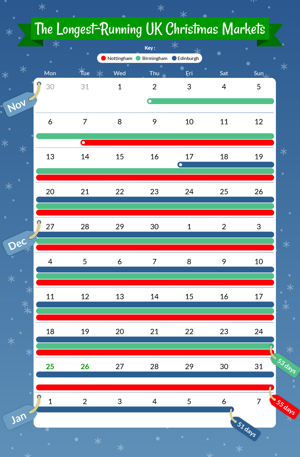 We found the number of days running for each Christmas market using the event holder’s website.