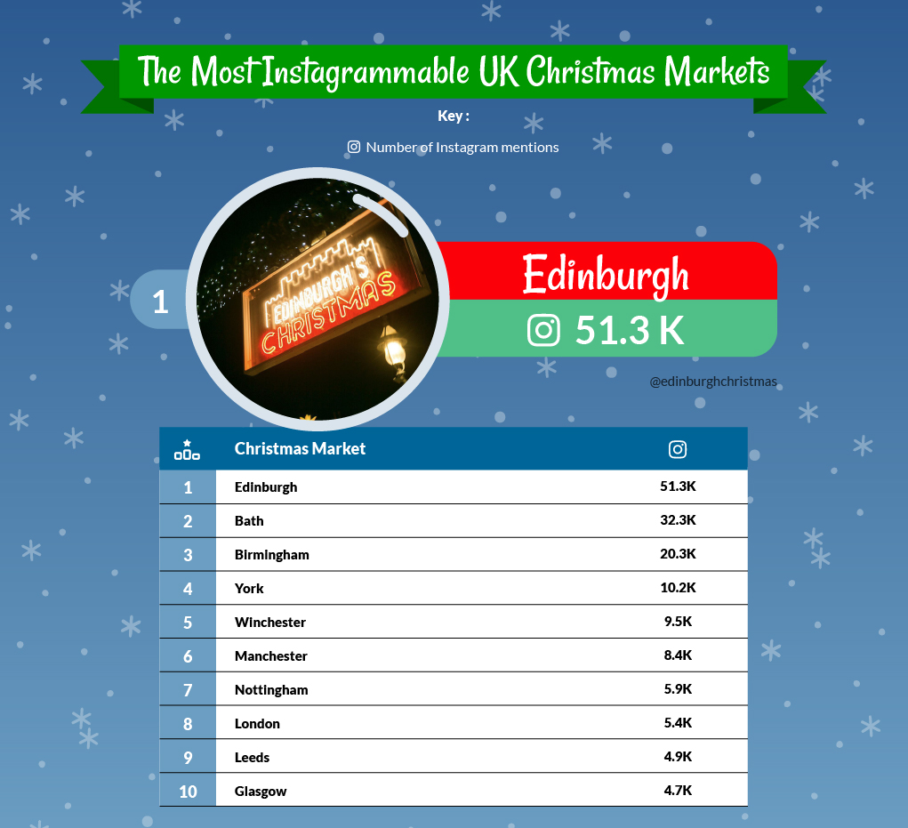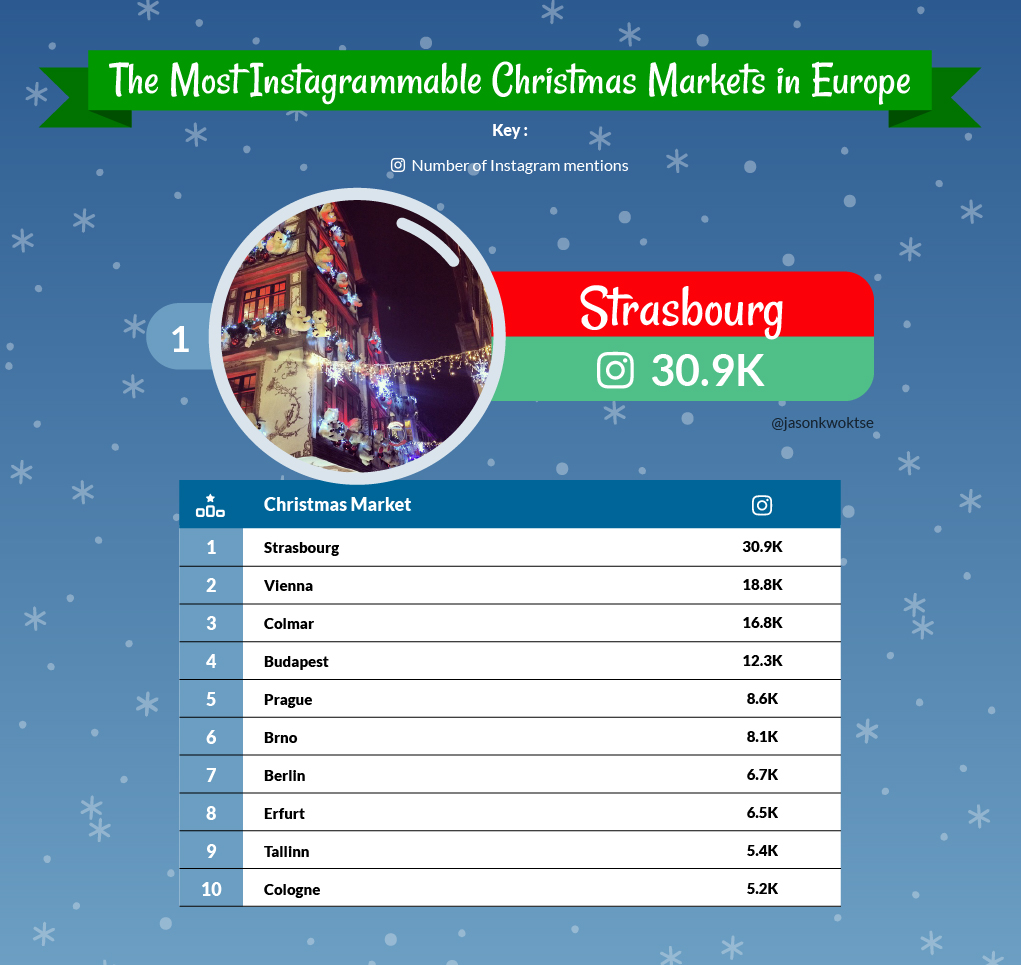 If you’re looking for Christmas markets fit for the grid, then look no further, as we have a great selection, with Strasbourg in France gaining more than 30,900 hashtag mentions.