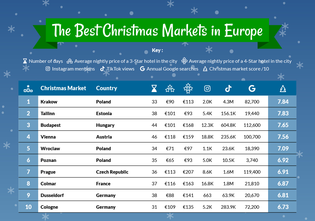 Officially known as the Budapest Christmas Fair and Winter Festival, the market runs for 44 days from November through the end of December. The Hungarian capital opens with tinkling market stalls and majestic architecture, where tourists can enjoy a cup of mulled wine, sweet chimney cake, and all the festive cheer. Budapest scored well for its affordable accommodation (€101 per night at a three-star hotel) and Instagram mentions (12,300 posts). There were also many TikTok tag views at Budapest’s Christmas market (604,800 views).