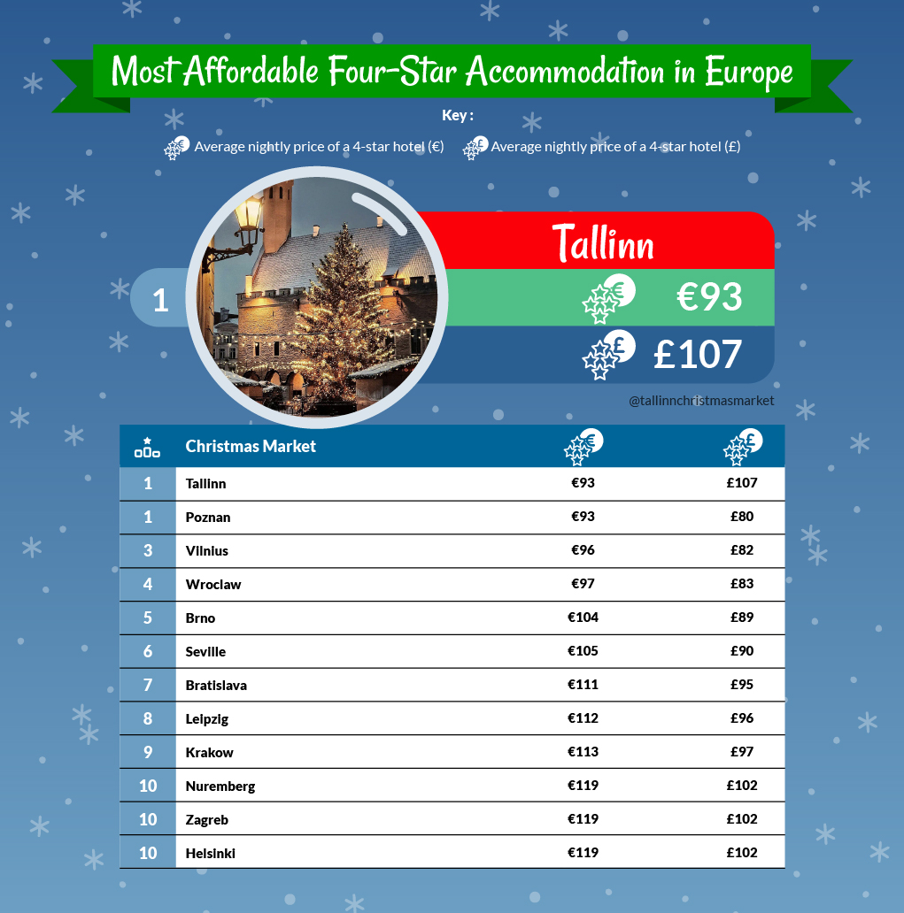 There are plenty of Christmas markets that can be enjoyed on a budget with the Polish city of Poznan and Estonia’s Tallinn averaging as little as €93 per night for a four-star hotel.