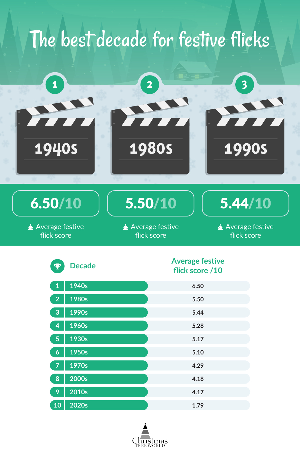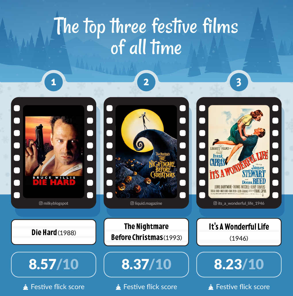 Taking the top spot are movies from the golden age of cinema, with festive flicks from the era scoring an average of 6.50/10. Oscar-winning movies, like It’s A Wonderful Life and Miracle on 34th Street, are considered classic Christmas flicks and have delighted audiences for more than 70 years!