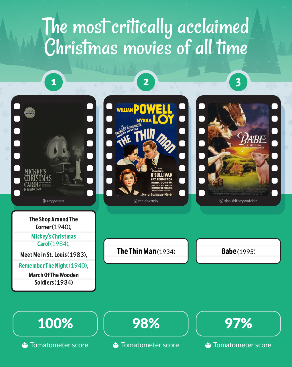 The most critically acclaimed Christmas movies: The percentage of positive reviews for each film according to Rotten Tomatoes.