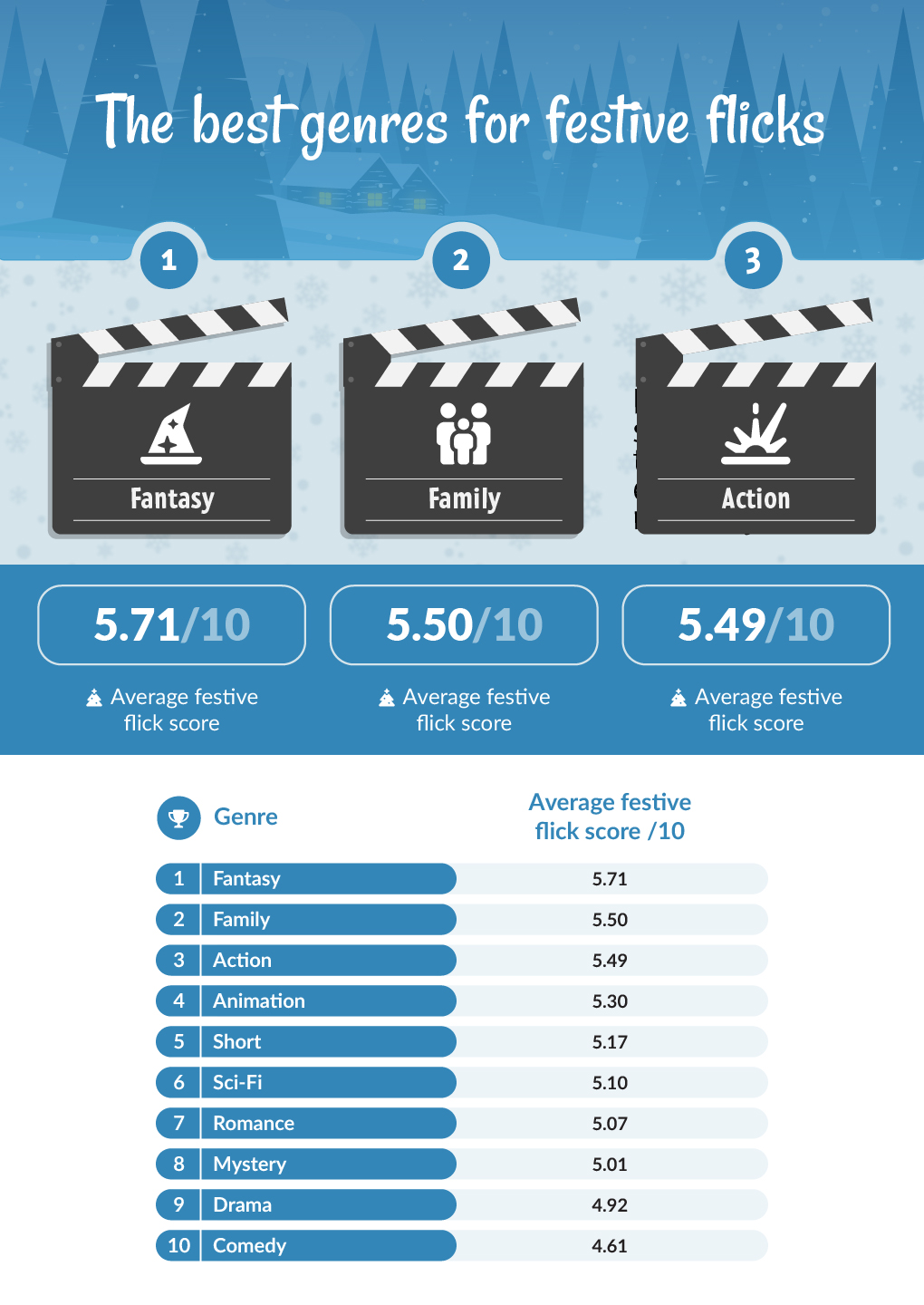 Taking first place as the most popular genre for Christmas films is fantasy, with an average score of 5.71. This is unsurprising as Christmas is the most magical time of year for many families and fantasy films can add that extra touch of magic to the festive season.